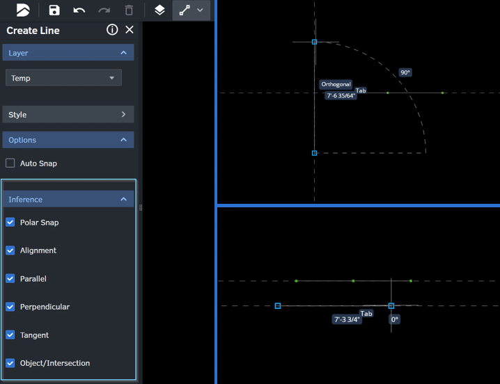 Added Inference snapping when creating line segments. Hover over an entity to engage inference snapping. Ghost lines will appear when aligned vertically, horizontally, parallel, or orthogonal to the engaged entity. This can also be used to easily draw parallel line segments. To temporarily disable inference, expand the Inference section in the left panel and uncheck Alignment, Parallel, and/or Orthogonal.