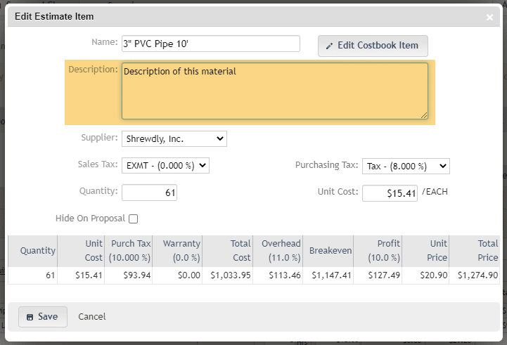 • Showing Item Description on Estimate: We have added the option to be able to see the description of items when the Edit Item dialog is opened on Construction Estimates. The description can be edited (only applies to this Estimate). For existing Estimates, the description will only be shown in the item already had a description in the Costbook. If a new description is added, the individual items can be edited and updated if you would like it to be shown.