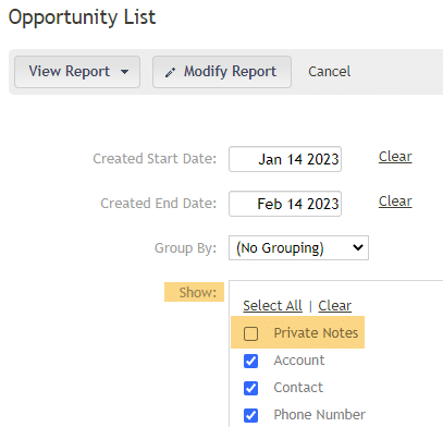 • Opportunity List Report – Private Notes: We have added a new option to the Opportunity List report. It is now possible to show the ‘Private Notes’ from the Opportunity on that report. It will be a new option in the Show section of the report parameters.