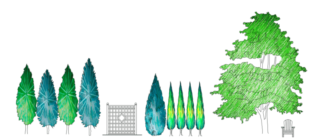 New 2D Trees library added with multi-stem trees, columnar trees for live privacy screens, and others, including Color Outline for use in DynaScape Color.